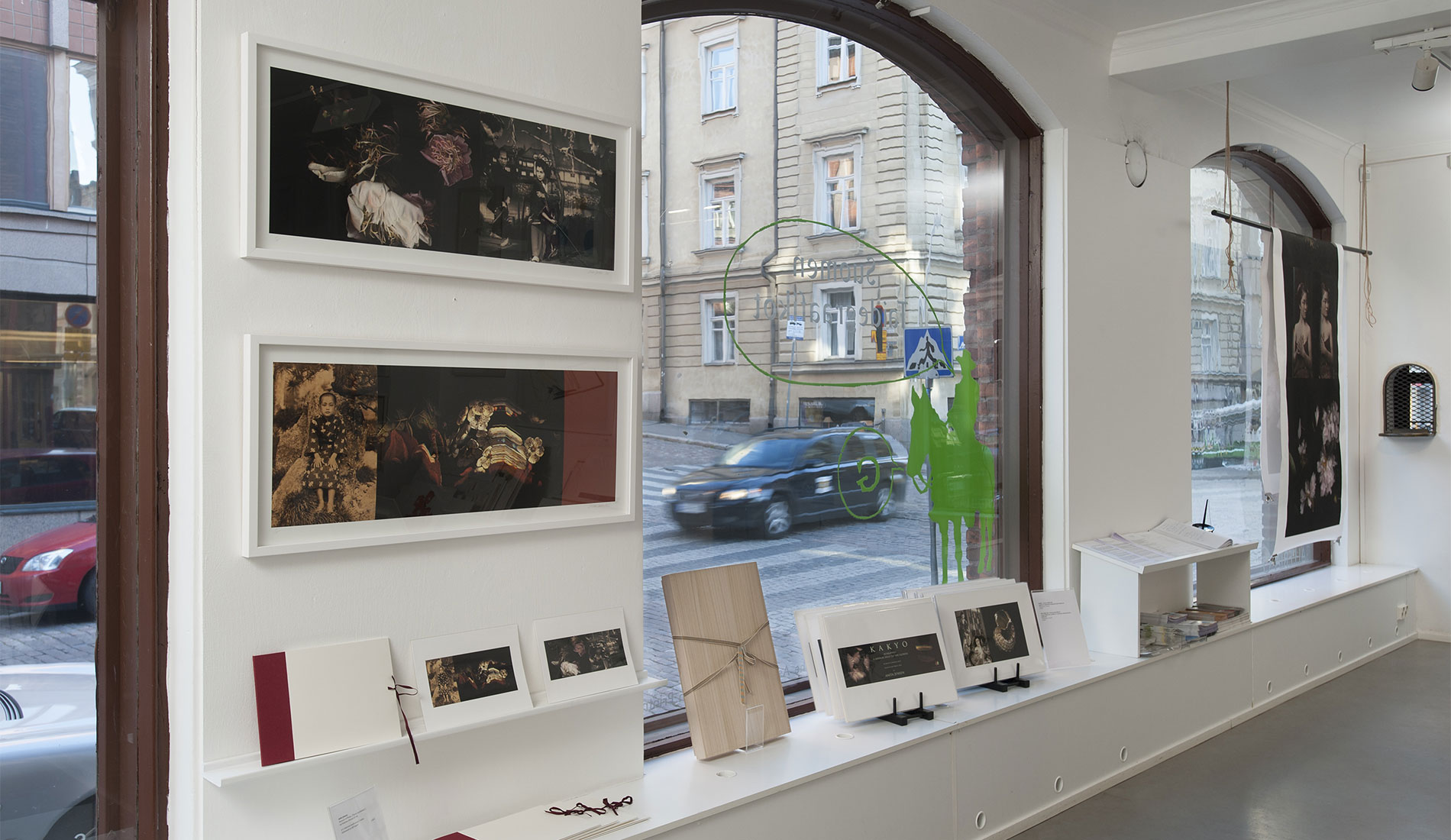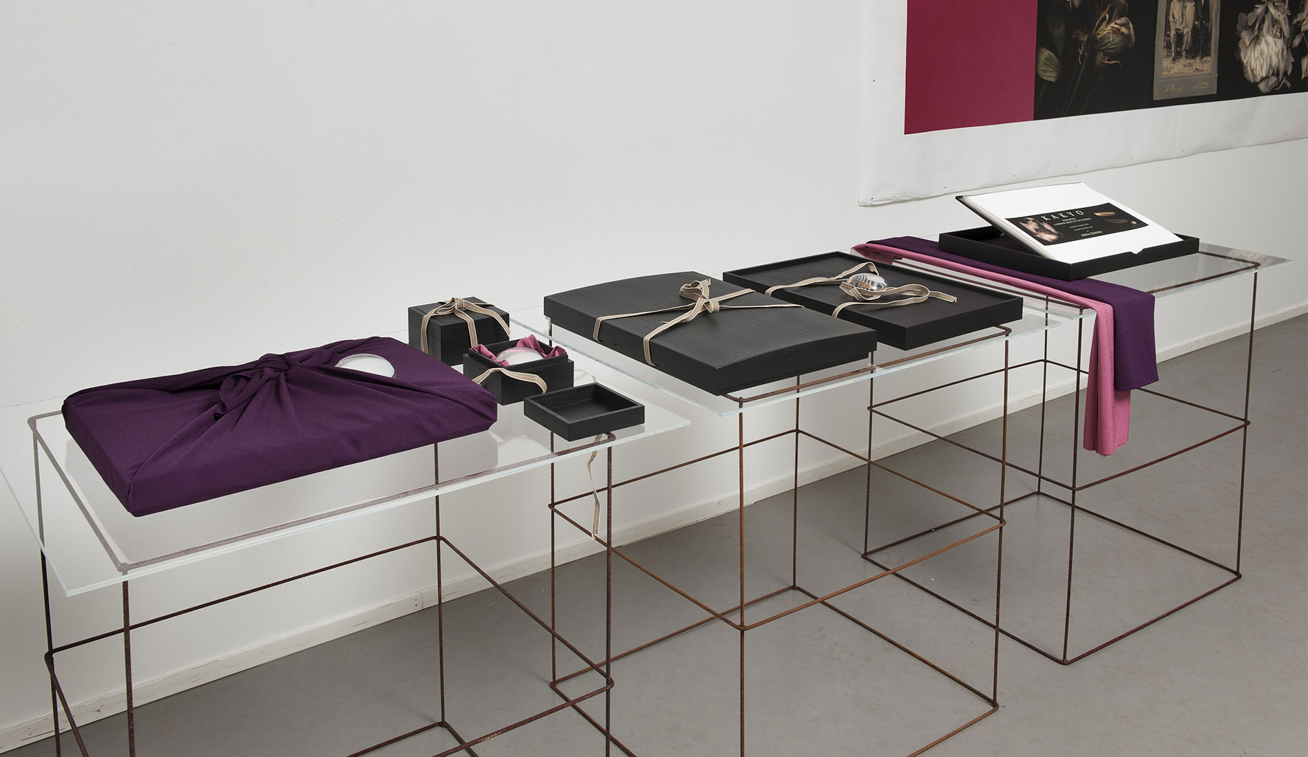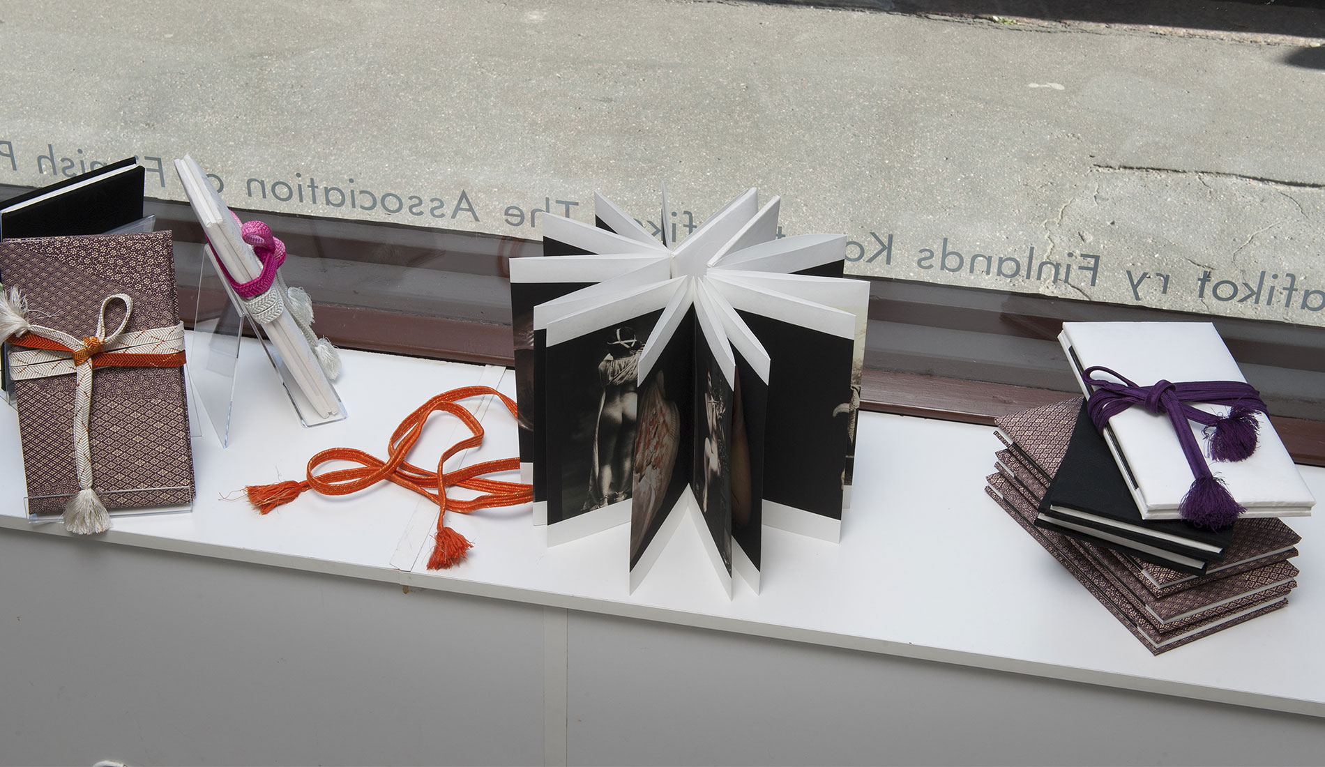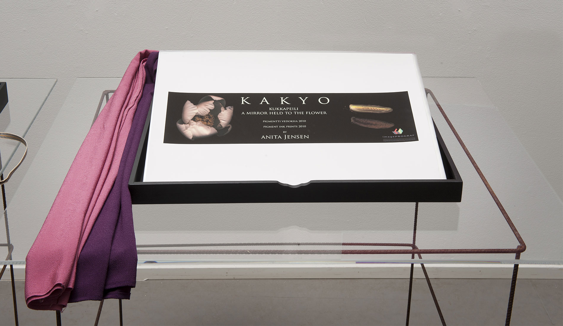 Paikallinen Byobu mestari Mr Shigeki Fujiwara valmisti vedoksistani perinteisen malliset Makura-­- ja Furosakibuobut. Esillä olevat Kiri-­-Bako boxit ovat myös vanhaa ja edelleen käytössä olevaa japanilaista lahja-­- ja pakkauskulttuuria. Suunnittelin omat työni niiden pohjalta ja mestari valmisti nämä esillä olevat versiot. Ne toimivat myös pienten vedossarjojeni säilytyskansioina ja lahjapakkauksia. Joihinkin laatikoihin olen suunnitellut tilan suupuhalletulle suurentavalle ”lukulasille”, jolle on myös oma erillinen pieni säilytysboxinsa Furoshiki liinoineen joihin kaikki kääritään, pakataan ja kätketään lopuksi. Isot työni seinälle vedostin Emaki – vaakakuvakääröihin ja Kakejiku – roikkuviin kuvarulliin sopiville paperilaaduille. Ne ovat tällä kertaa esillä vielä sellaisenaan, ilman taustaamista ja yhdistämistä muihin materiaaleihin.