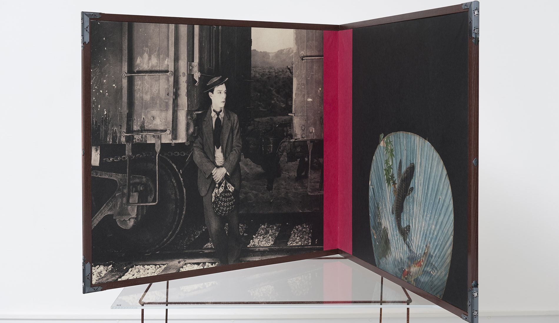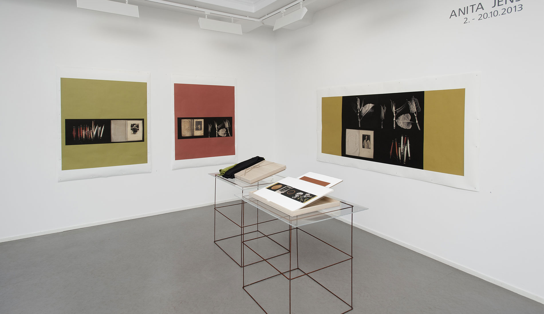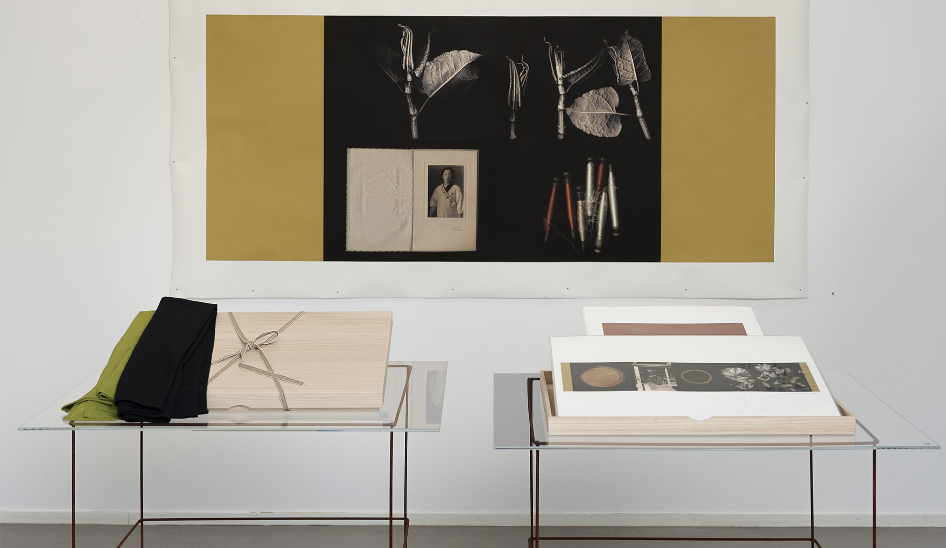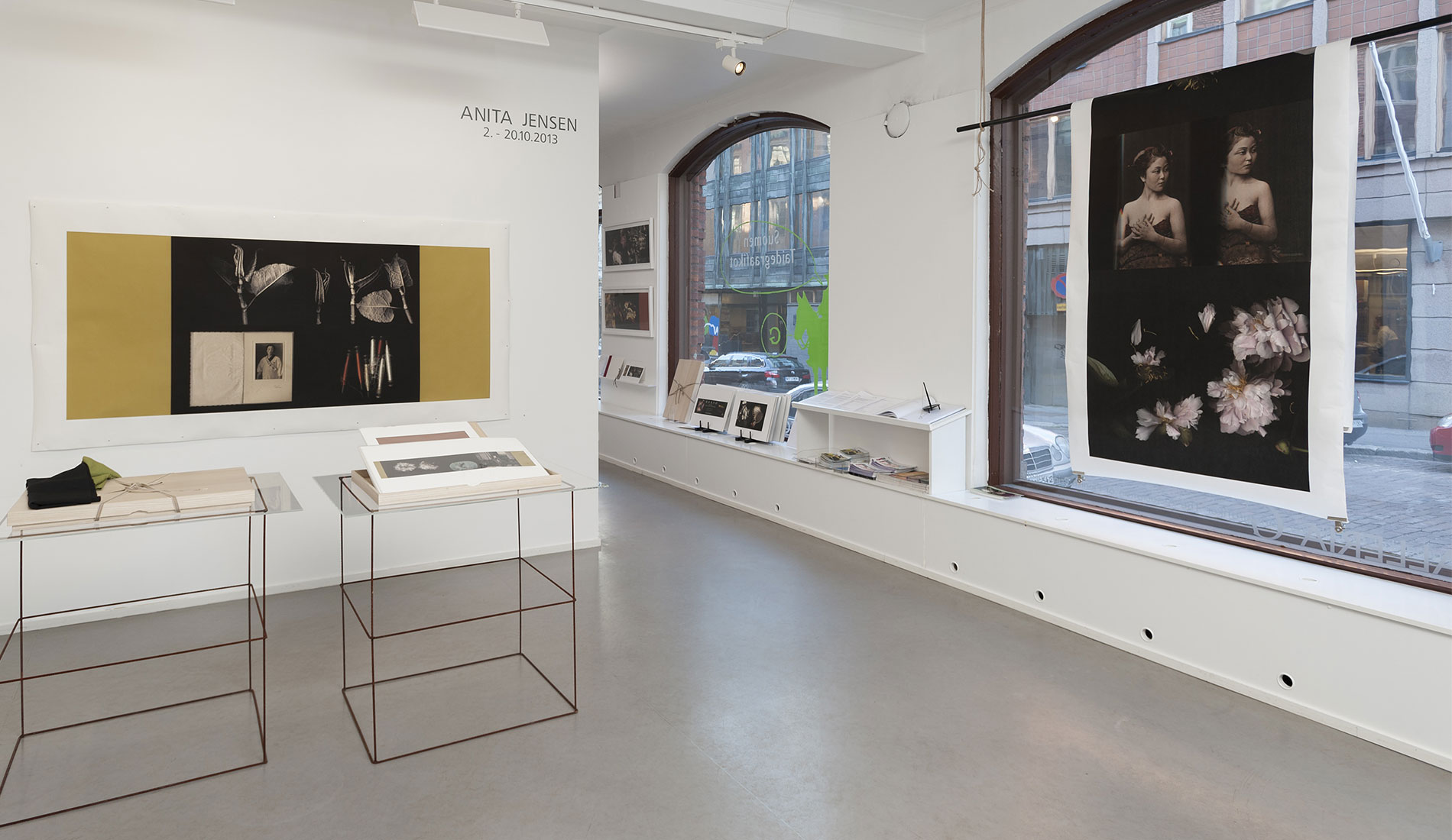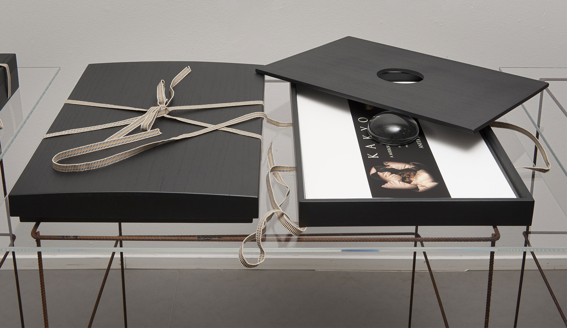 Paikallinen Byobu mestari Mr Shigeki Fujiwara valmisti vedoksistani perinteisen malliset Makura-­- ja Furosakibuobut. Esillä olevat Kiri-­-Bako boxit ovat myös vanhaa ja edelleen käytössä olevaa japanilaista lahja-­- ja pakkauskulttuuria. Suunnittelin omat työni niiden pohjalta ja mestari valmisti nämä esillä olevat versiot. Ne toimivat myös pienten vedossarjojeni säilytyskansioina ja lahjapakkauksia. Joihinkin laatikoihin olen suunnitellut tilan suupuhalletulle suurentavalle ”lukulasille”, jolle on myös oma erillinen pieni säilytysboxinsa Furoshiki liinoineen joihin kaikki kääritään, pakataan ja kätketään lopuksi. Isot työni seinälle vedostin Emaki – vaakakuvakääröihin ja Kakejiku – roikkuviin kuvarulliin sopiville paperilaaduille. Ne ovat tällä kertaa esillä vielä sellaisenaan, ilman taustaamista ja yhdistämistä muihin materiaaleihin.